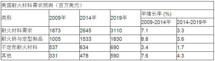 2015年6月最新一份預(yù)測報告顯示,美國對耐火材料的需求將以每年3.3%的速度增長,到2019年達到31億美元。隨著鋼鐵生產(chǎn)的放緩,2014-2019年間耐火材料的收益將會比2009-2014年間有所降低。耐火材料的銷量也將因整體產(chǎn)量的縮減而集中在一些使用壽命較長的耐火材料上。此外,市場對使用效果更好的耐火材料需求的增加,使其在價格攀升的同時提升了整體銷售額,也由于更換周期變長而令市場對耐火材料的總需求量有所減少。耐火原料價格的增長也會使耐火制品增值。此外,非金屬礦產(chǎn)行業(yè)有望成為增長最快的市場,采用一些高成本的耐火原料,也將促使耐火材料整體市場價值的增長。