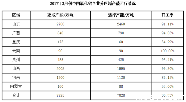 2017年3月份國(guó)內(nèi)氧化鋁企業(yè)產(chǎn)能運(yùn)行分析