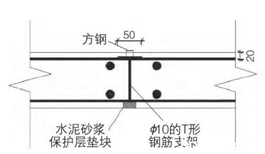T形鋼筋支架采用鋼筋, 縱向間距2 m, 上口高程測(cè)量后, 與平臺(tái)底部鋼筋電焊固定, 底部設(shè)置保護(hù)墊層, 防止鋼筋支架下沉 (圖1) 。