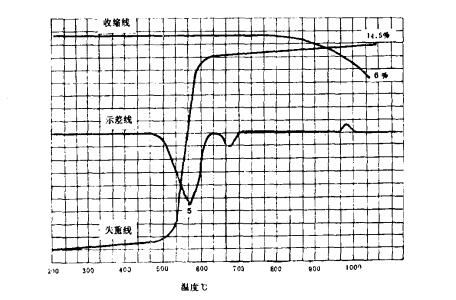 綜合熱潛圖有三條特性曲線,即差熱線,失重線,收縮線。差熱線由差熱分析法得出的,差熱分析是用一種沒(méi)有放熱和吸熱反應(yīng)的材料(稱為中性體)與有熱效應(yīng)的材料作溫升比較。中性體在加熱過(guò)程中溫度是持續(xù)上升的,溫度是時(shí)間的線性函數(shù)。有熱效應(yīng)的材料當(dāng)有吸熱效應(yīng)時(shí),與中性體出現(xiàn)了溫差,溫升滯后,在這個(gè)溫度區(qū)間形成一個(gè)吸熱峰:如果是放熱反應(yīng),材料溫度將高于中性體。于是出現(xiàn)了一個(gè)放熱峰。放熱峰說(shuō)明是有晶體轉(zhuǎn)變,或者是有析晶現(xiàn)象,吸熱峰除了晶體的變異外,還有晶體的失水過(guò)程。