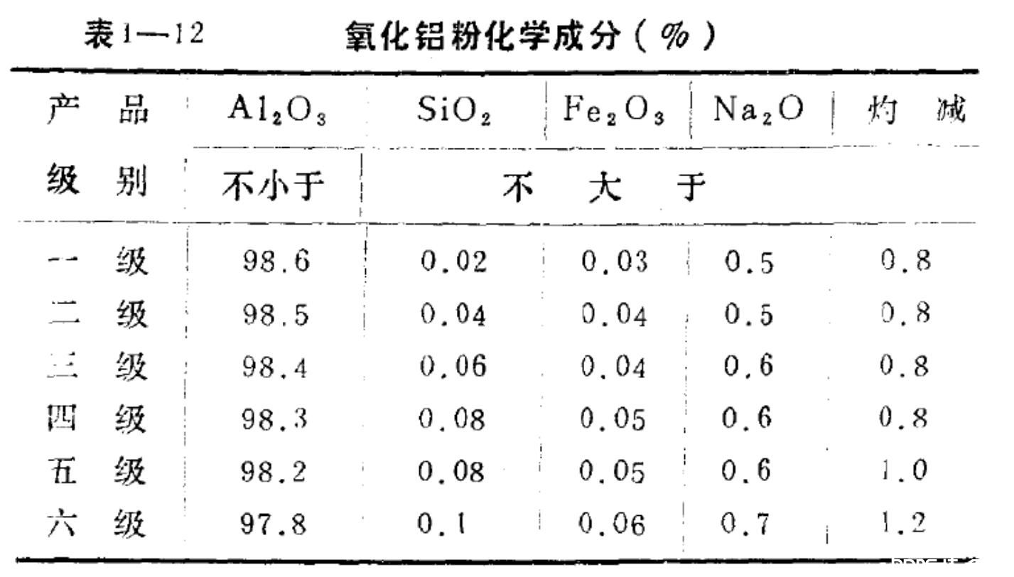 氧化鋁的部頒標(biāo)準(zhǔn)見(jiàn)下表1一12。