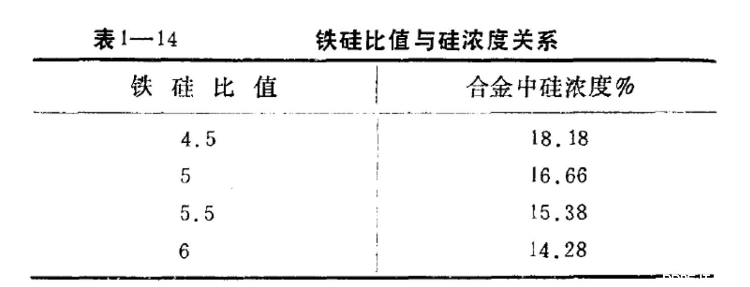 不同鐵硅比與相應(yīng)的合金中硅濃度關(guān)系見表1一14