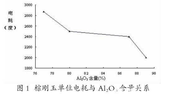 我國的棕剛玉生產起初都是用固定爐進行生產的,上世紀七十年代出現了傾倒爐生產工藝,目前我國棕剛玉生產使用固定爐和傾倒爐的比例大約為3:4。不論是固定爐也好或是傾倒爐生產也罷,其生產工藝基本相似,都是以鋁礬土為主要原材料,再配以其它輔助材料在礦熱爐中經高溫熔化,經一系列的物理化學反應而制得的,是一種能耗比較高的產品,其能耗費用在生產成本中約占1/2-2/3。因此鋁礬土品質的好壞決定了能耗的高低。上世紀八十年代之前,生產棕剛玉所用的鋁礬土其Al203含量均為80%左右,鋁硅比為20:1,用這種高品位鋁礬土生產棕剛玉時,固定爐的單位耗電為2600KW H左右,傾倒爐單位耗電為2500K W H左右。鋁礬土中的Al203含量與單位耗電的關系如圖1