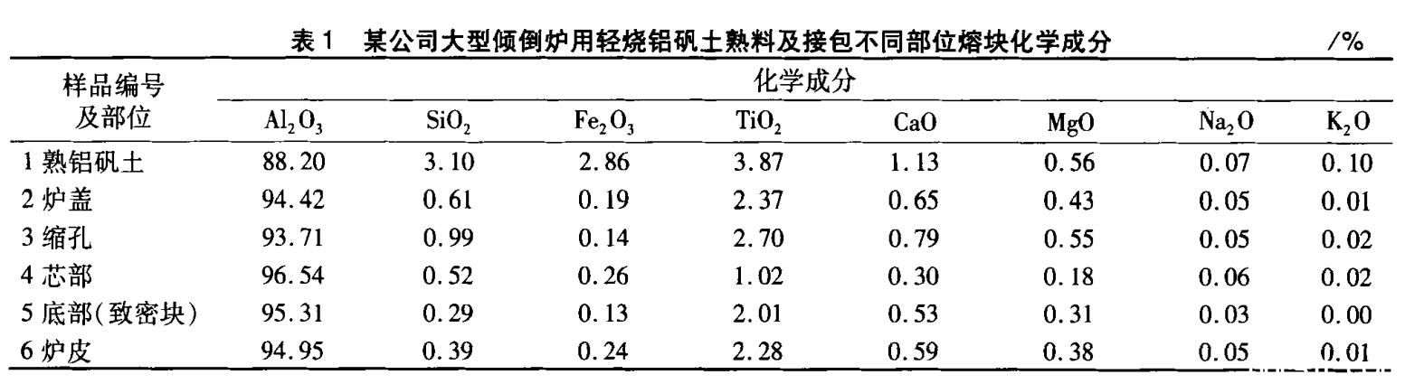 為了探究雜質(zhì)礦物元素在棕剛玉冶煉工藝過程中的反應(yīng)行為及其在熔塊不同部位的富集行為,作者對(duì)國(guó)內(nèi)某公司大型棕剛玉傾倒?fàn)t進(jìn)行取樣分析,同一爐對(duì)應(yīng)的鋁礬土熟料及接包不同部位熔塊的化學(xué)成分如表1所示。